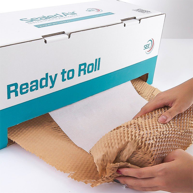 Acest sistem de ambalare cu hartie dubla este ideal pentru ambalarea unui volum redus de pachete. Pentru utilizarea acestui dispenser nu este nevoie de asamblare, electricitate sau reglare a tensiunii. Pe partea inferioara, dispenserul prezinta banda dublu adeziva pentru a asigura stabilitatea pe masa de ambalare in timpul utilizarii. Odata ce hartia se epuizeaza, intregul sistem poate fi reciclat.