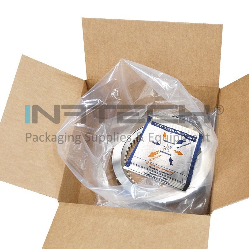 Substantele active VCI se evapora din materialul purtator (hartie, folie LDPE, folie stretch, folie cu bule de aer) in spatiul incapsulat al ambalajului;