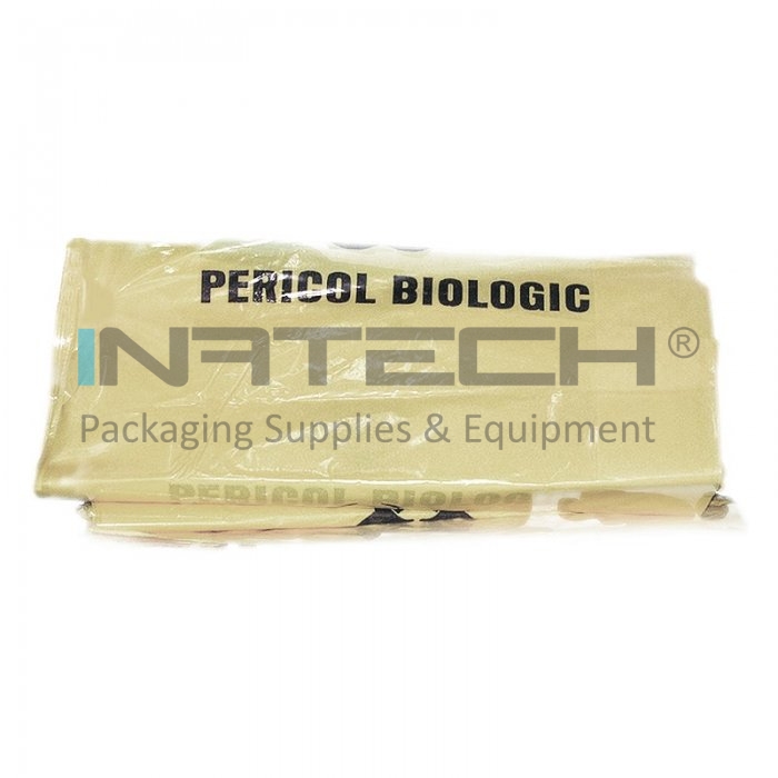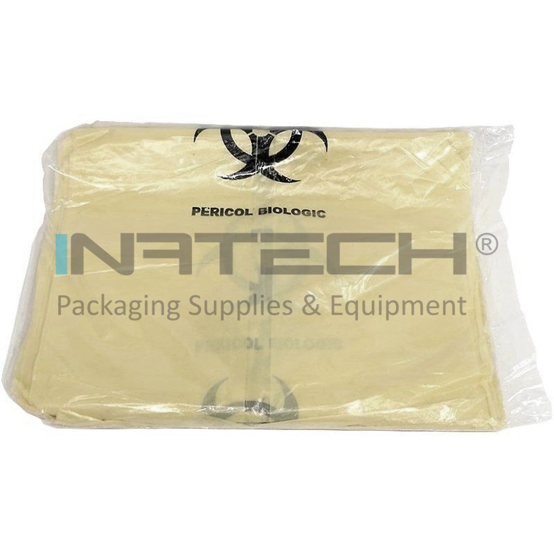Sacii Galbeni PERICOL BIOLOGIC sunt confectionati pentru colectarea reziduurilor medicale sau a deseurilor infectioase. Pe langa mesajul inscriptionat, sacii din polietilena de culoare galbena contin si pictograma care arata prezenta unui pericol biologic. Sacii inscriptionati PERICOL BIOLOGIC sunt realizati din polietilena rezistenta la soc mecanic si presiune.