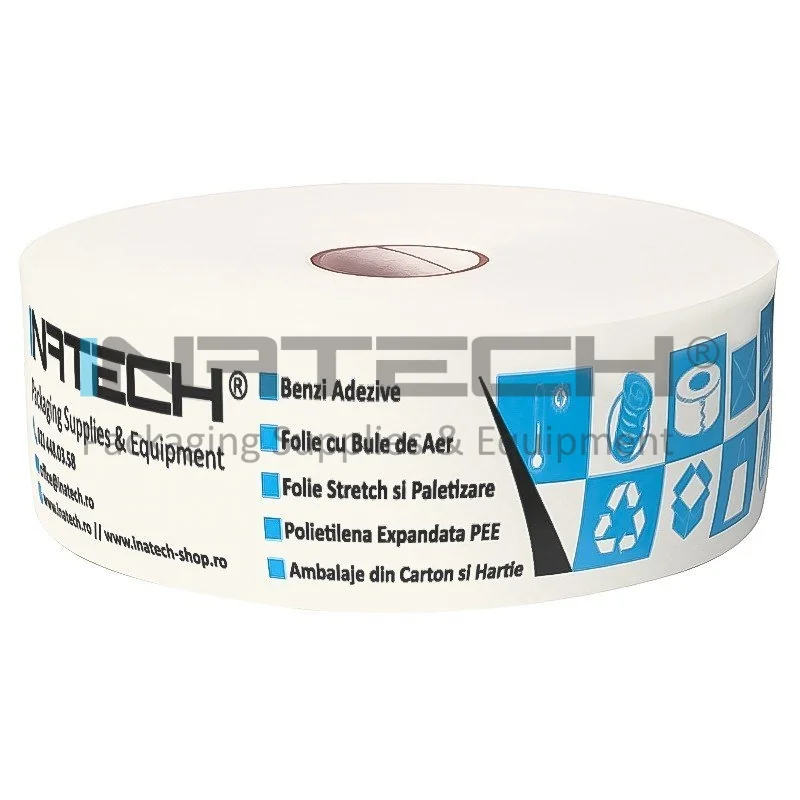 Banda Adeziva Umectibila Personalizata 60 mm x 200 m Lungime 200 m, Numar Culori 1 Culoare, Latime 60 mm, Adeziv Amidon, Tip Imprimare Pe Suprafata, Culoare Alb, Buc / Pachet 250