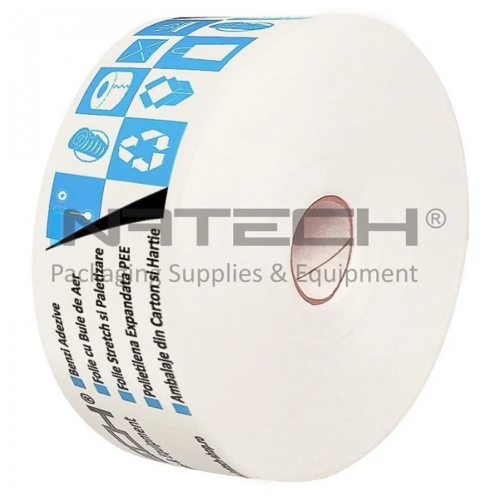 Banda Adeziva Umectibila Personalizata 60 mm x 200 m Lungime 200 m, Numar Culori 2 Culori, Latime 60 mm, Adeziv Amidon, Tip Imprimare Pe Suprafata, Culoare Natur, Buc / Pachet 250
