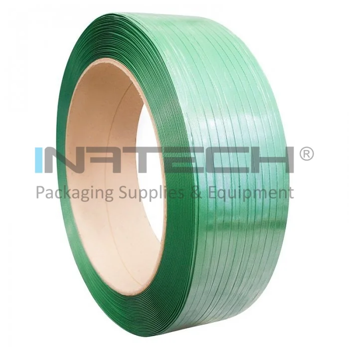 Banda PET Verde embosata este o banda din poliester cu o mare rezistenta si cu o alungire redusa si reprezinta o alternativa la aplicatiile care utilizeaza banda metalica. Are proprietati asemanatoare cu banda metalica.