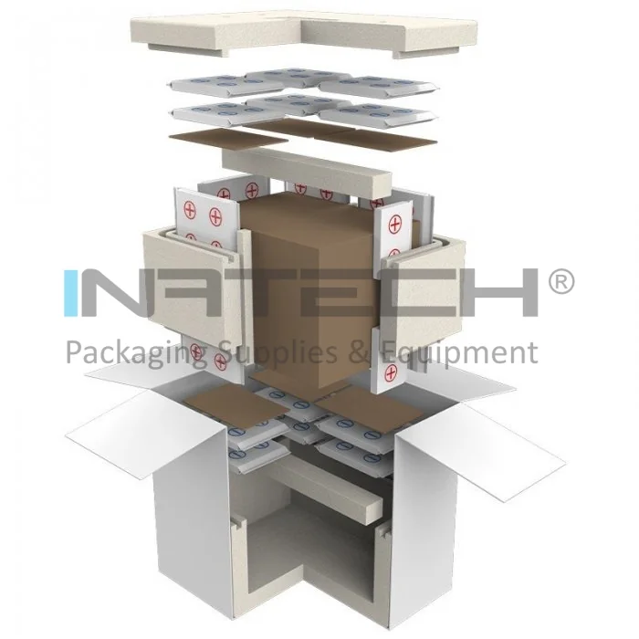 Sistemul este compus din: cutie carton exterior, cutie polistiren, cutie carton interna pentru produse, separator carton si rezerve pentru racire pe baza de apa din spuma.