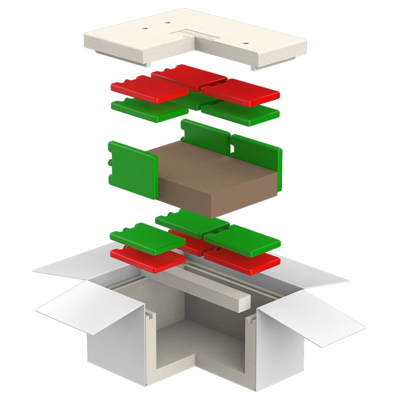 Sistemul este compus din: cutie carton exterior, cutie polistiren, cutie carton interna pentru produse si rezerve pentru racire PCM 18°C si PCM 21°C din plastic.