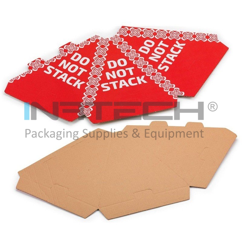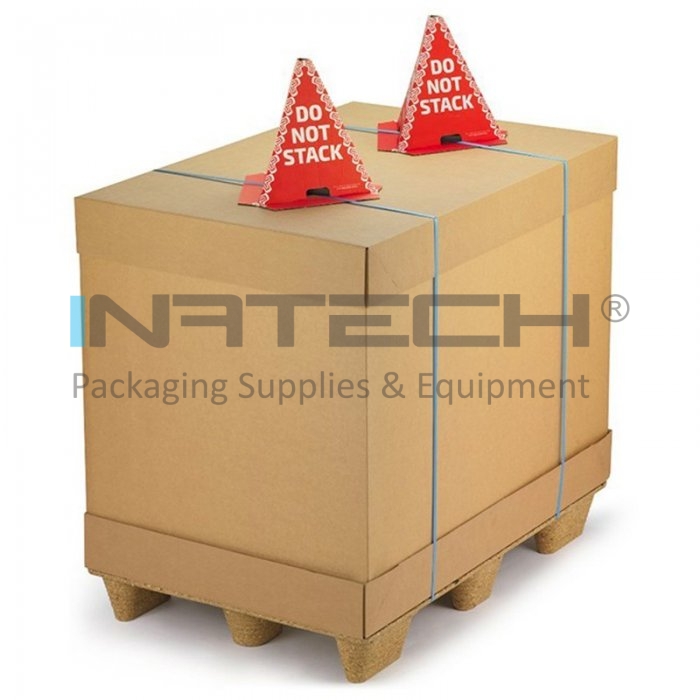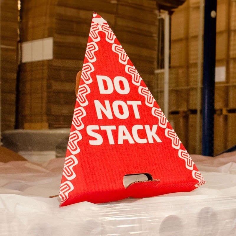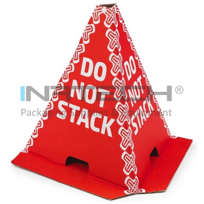 Conurile de protectie realizate din carton ondulat au inscriptionat o expresie vizibila „DO NOT STACK” cu alb pe un fundal rosu aprins.