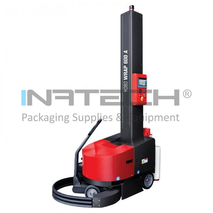Robot Paletizare 600 A este o masina de paletizat folosita pentru infoliat paleti de orice forma, greutate si dimensiune. Este o masina de paletizat autopropulsata, alimentata cu baterii, proiectata pentru infasurarea incarcaturilor paletizate de orice forma, greutate si dimensiune folosind folie intinsa. Reglarea tensiunii filmului extensibil are loc printr-un ambreiaj mecanic reglabil manual de catre operator.