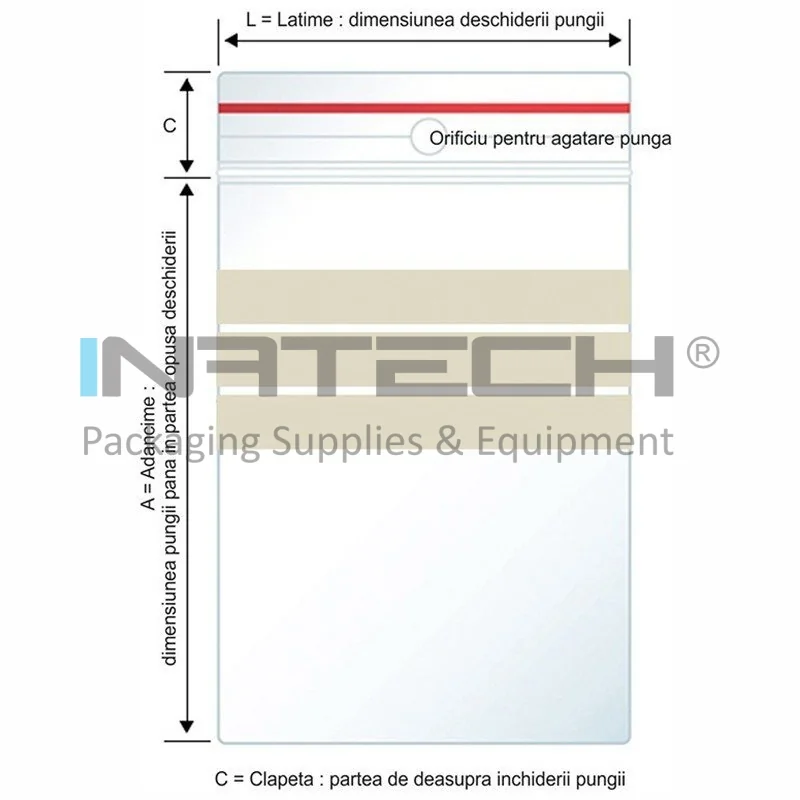 Au diverse dimensiuni si sunt ambalate in cutii, 100 buc/pachet. Pungile cu inchidere tip fermoar au trei linii rosii si gaura pentru agatare si benzi de scriere opace.